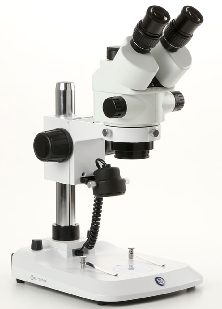- Der Zahnstangen- und Säulestativ die StereoBlue Mikroskope verfügen über ergonomisch geformtes Stativ, komplett mit zwei Objekt Klammern und Ø 60 mm transparent- und schwarz/weiß Objekttischplatte